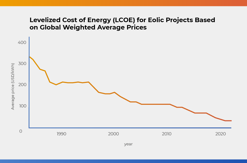 Despite being a much more mature technology, wind energy also experienced a significant price drop: from USD 107 per MWh in 2010 to USD 39 per MWh in 2020 and USD 33 per MWh in 2023. In 1984, the price was USD 339 per MWh, highlighting a remarkable decline over time. In other words, the cost of generating one MWh of electricity with wind energy decreased by approximately 68.44% between 1984 and 2010, 63.55% between 2010 and 2020, and 15.38% between 2020 and 2023.
